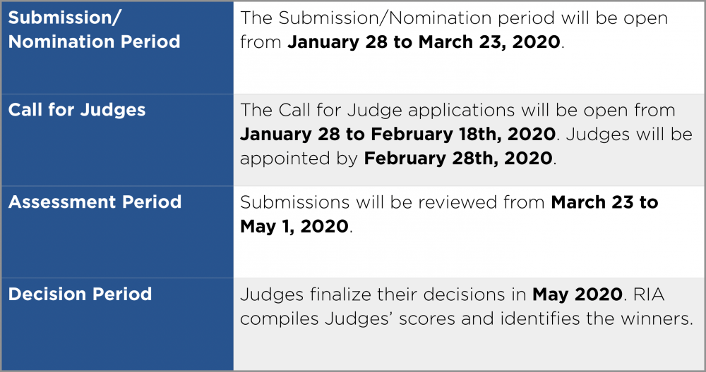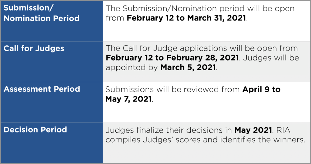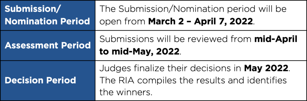 The Submission/Nomination period will be open from March 2, 2022 to April 7, 2022 . All Awards candidates must be members of the RIA for at least one year as of January 1, 2022. Awards candidates must be RIA members in good standing on the date they enter their submission, and on June 6, 2022 when the Awards are presented.